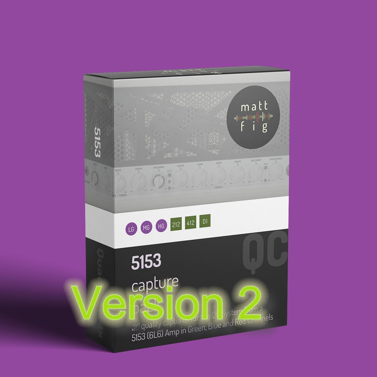 18 professionally created studio and DI captures created from an EVH 5153 Stealth Amp. You get Green, Blue and Red Channels in Low Gain, Mid Gain, High Gain. This amp is a studio favorite and one that I know quite well. These captures are ready to go into the mix, right now! The Mattfig cab has 4 EVH speakers and full DI.